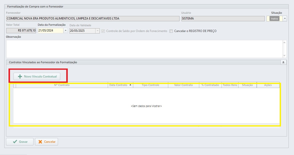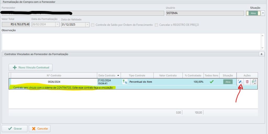 Quando existir algum contrato já cadastrado que não estiver vinculado ao sistema Contrato, será necessário editar o mesmo e fazer o vínculo.