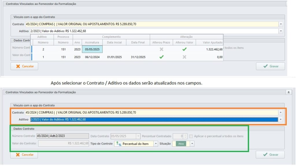 Agora, o sistema trará os dados do contrato/aditivo que foi vinculado à formalização de compra. Atente para a data do contrato, pois, o Mês/Ano que foi selecionado na entrada do sistema deverá ser o mesmo da data de assinatura do contrato.