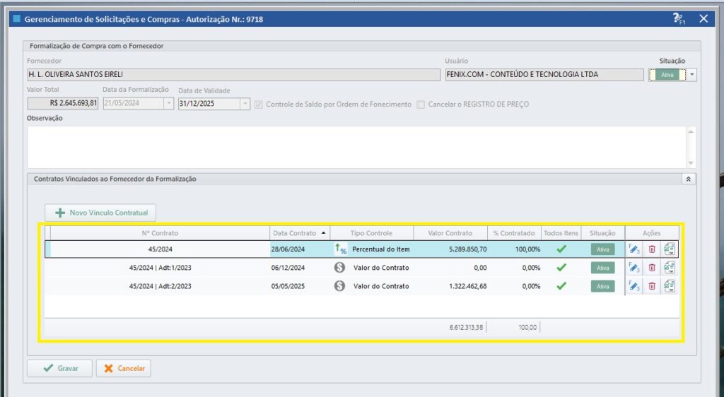 Quando informar um contrato, este só poderá ser alterado/excluído quando não existir Ordem de Fornecimento; ou se a quantidade das ordens de fornecimentos dos itens já efetuadas não fizerem parte do percentual do contrato;