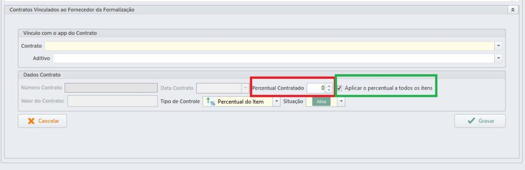 Se o tipo de controle for Percentual do Item será necessário informar o percentual individual (que será apresentada após o clique no botão Gravar) ou se o percentual informado for para todos os itens da formalização do fornecedor, basta marcar a caixa de seleção “Aplicar o percentual a todos os itens” e informar o percentual contratado, para todos os itens. Será melhor detalhada essa questão mais abaixo.